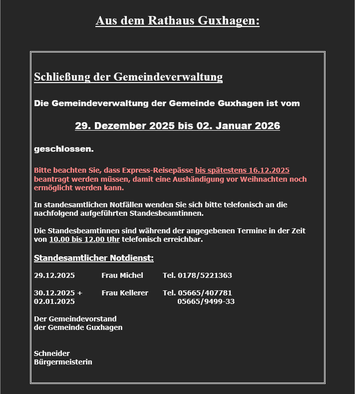 Schließung der Gemeindeverwaltung „Zwischen den Jahren“