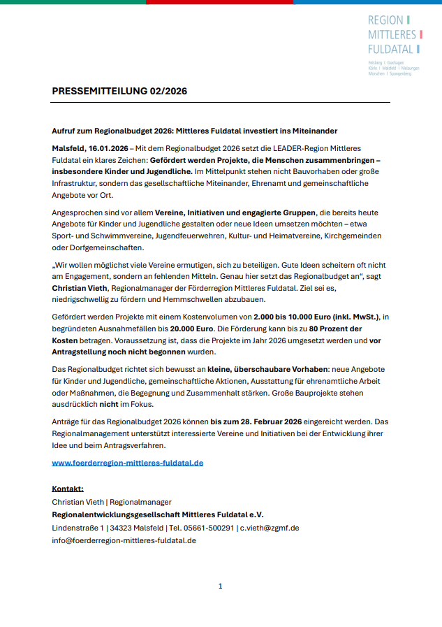 26Jan.FacebookTwitterGoogle+LinkedInPinterest Zuwendungsantrag Regionalbudget 2026in Aktuelles Förderaufruf Regionalbudget 2026 Pressemitteilung Zuwendungsantrag Zuwendungsantrag HIER HERUNTERLADEN